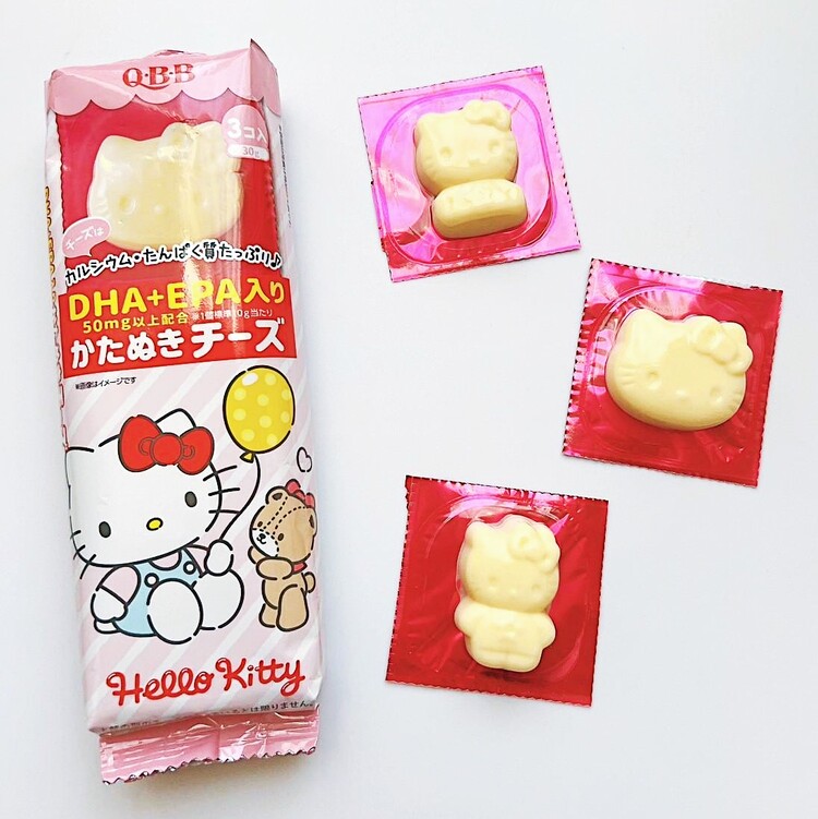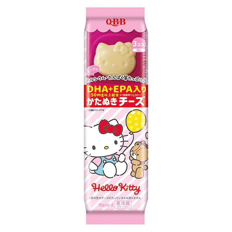 제품명 : 헬로키티 모양 치즈 / 원산지 : 일본 / 식품의 유형 : 가공치즈 [살균제품 72℃에서 15초간 살균] / 제조원 : Rokko Butter Co., Ltd. / 용량 : 30g (104kcal, 10g x 3개입) / 원재료명 및 함량 : 자연치즈 76.4%[우유,소금,렌넷,배양균], 정제수, 폴리인산나트륨, 어유, 구연산삼나트륨, 탄산수소나트륨 / 포장재질 : 외포장-PP, 내포장-PP, 용기-PP / 보존기준 : 냉장보관(0℃~10℃) / 보관상 유의사항 : 개봉 후 냉장보관하거나 빨리 드시기 바랍니다. / 소비기한 : 제품 별도 표기