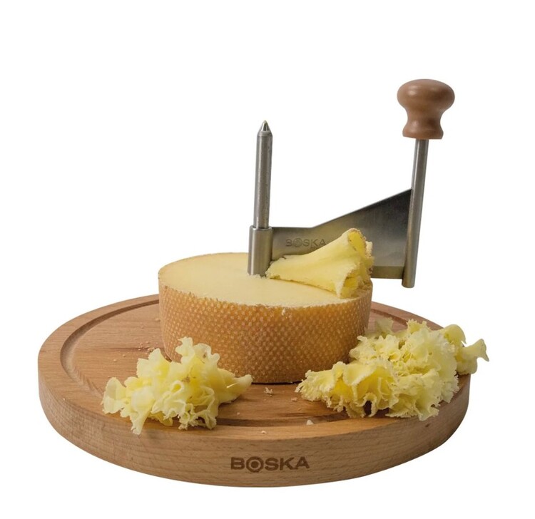 치즈에 풍미와 스타일을 더해주는 컬러 : 치즈 컬러 또는 지롤이라고 불리는 이 도구는 너도밤나무와 스테인리스 스틸로 제작되어 내구성을 자랑합니다. 베이스에 있는 5개의 핀이 컬링하는 동안 치즈를 제자리에 단단히 고정시켜줘 테트 드 무안의 섬세한 컬을 만드는 데 적합합니다.