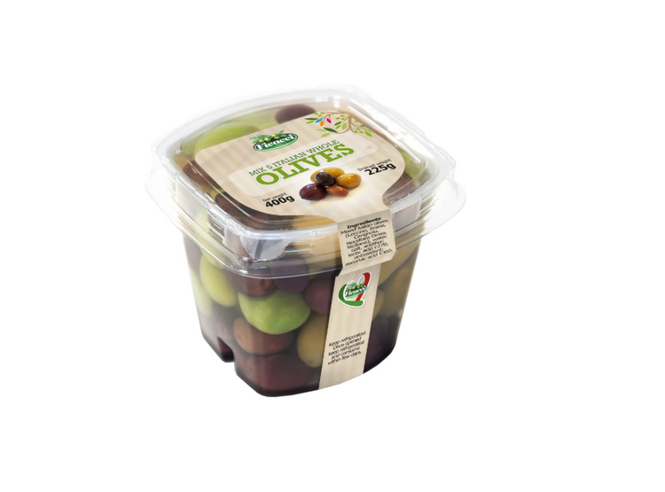 제품명 : 이탈리안 올리브 5종 믹스 / 원산지 : 이탈리아 / 식품의 유형 : 절임식품 / 제조원 : ROMEO FICACCI SRL / 용량 : 400g(고형량 225g) / 원재료명 및 함량 : 올리브 55%, 정제수, 소금, 젖산, 비타민C / 포장재질 : 트레이(페트,FE), 필름(EVOH) / 보관방법 : 냉장 보관. 개봉 후 가급적 빨리 드시기 바랍니다. / 유통기한 : 제품 별도표기일 까지(일/월/년 순) / 주의사항 : 올리브 씨가 단단하여 치아가 손상될 수 있으니 취식 시 유의 바랍니다.
