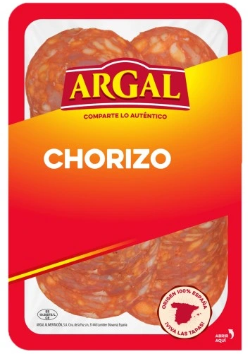 제품명 : 초리조 카스텔라노 슬라이스 / 식품의 유형 : 소시지(비살균제품) / 원산지 : 스페인 / 제조사 : ARGAL ALMENTACION, S.A. / 용량 : 80g(393kcal) / 원료명 및 함량 : 돼지고기 92.11%, 정제소금, 파프리카 우유분말, 대두단백, 설탕, 마늘, 덱스트린, 포도당, 산화방지제(에리토브산나트륨), 육두구, 산도조절제(산성피로인산나트륨), 보존료(아질산나트륨, 질산칼륨), 카민(착색료) 돼지고기, 우유, 대두 함유 / 포장재질 : 폴리에틸렌 / 보관방법 : 0~5도 냉장보관 / 보관상 유의사항 : 본 제품은 냉장 제품이므로 냉동시키지 마시길 바랍니다. / 소비기한 : 제품별도표기일까지(Best Before : 일, 월, 년 순으로)