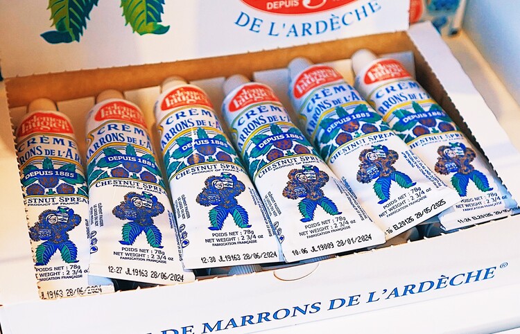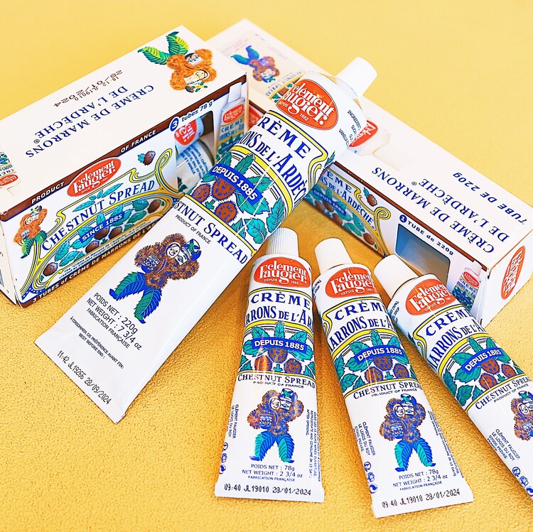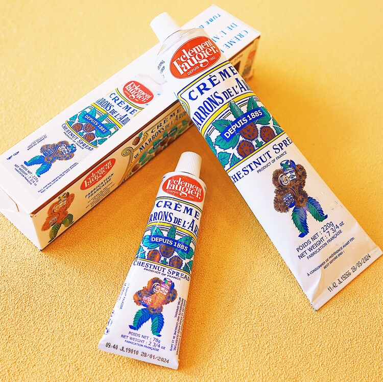 제품명 : 체스트넛 스프레드 (밤 50.6% 함유) / 원산지 : 프랑스 / 식품의 유형 : 땅콩 또는 견과류 가공품 / 제조원 : CLEMENT FAUGIER / 용량 : 220g(자이언트 튜브), 78g(밤잼튜브) / 원재료명 및 함량 : 밤 54.6%, 설탕 27.4%, 포도당시럽 17.99%, 천연바닐라추출물 0.01% / 포장재질 : 철 / 보존기준 : 직사광선을 피하고 서늘한 곳에 보관 / 유통기한 : 제품 상단 또는 하단의 별도표기일(일,월,년순)까지